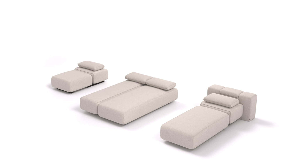 BonBon3 E+ è un divano modulare che si adatta a te. In un attimo, trasformalo in un divano angolare o allungabile, in un letto a tre posti o in un letto matrimoniale.